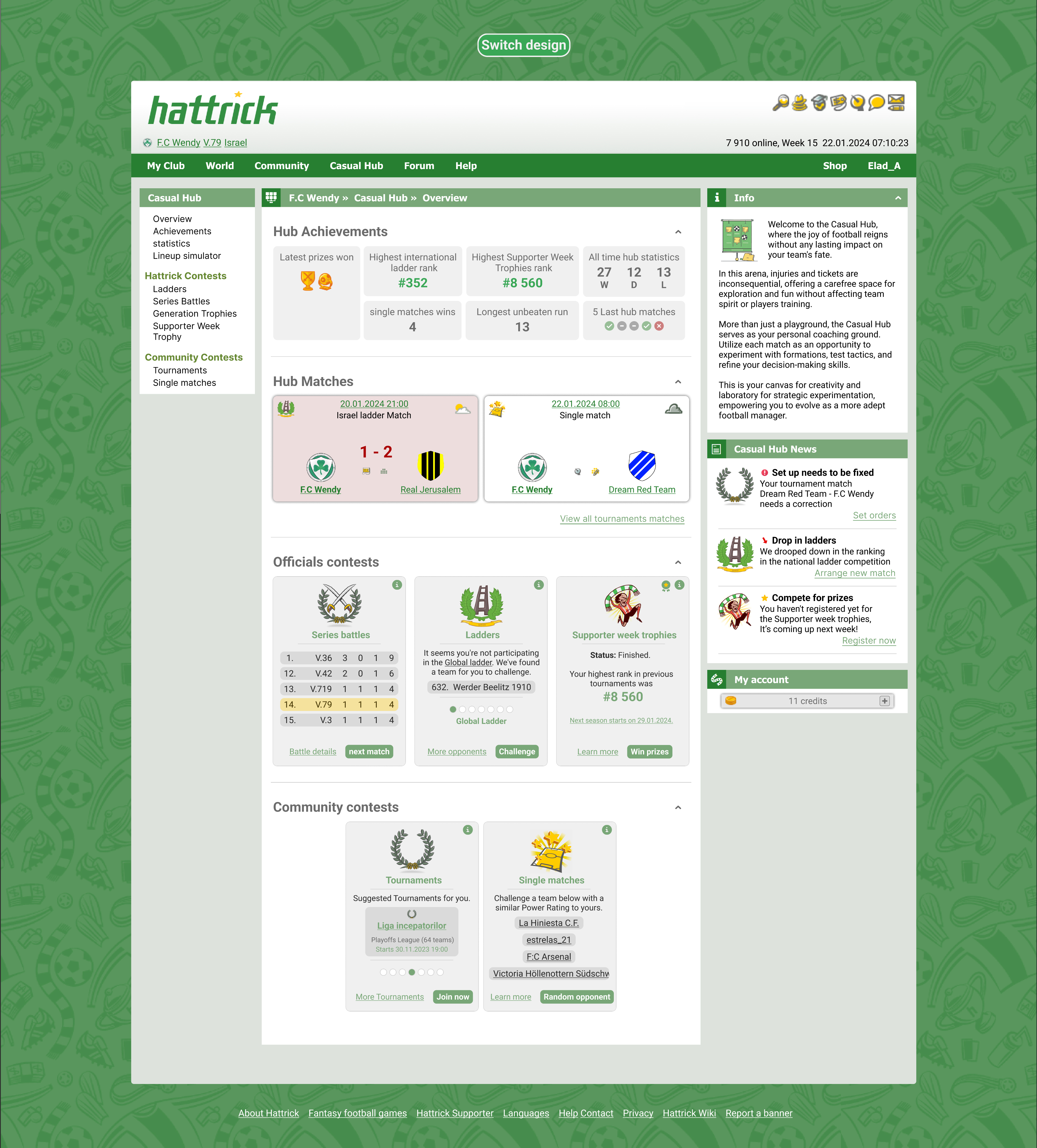 Hattrick (230k+ users) suffered from fragmentation. We consolidated scattered gameplay into a single "Casual Hub," increasing active users from 200k to 233k. **Impact: π +16.5% Active Users | π +20% Tournament Play**